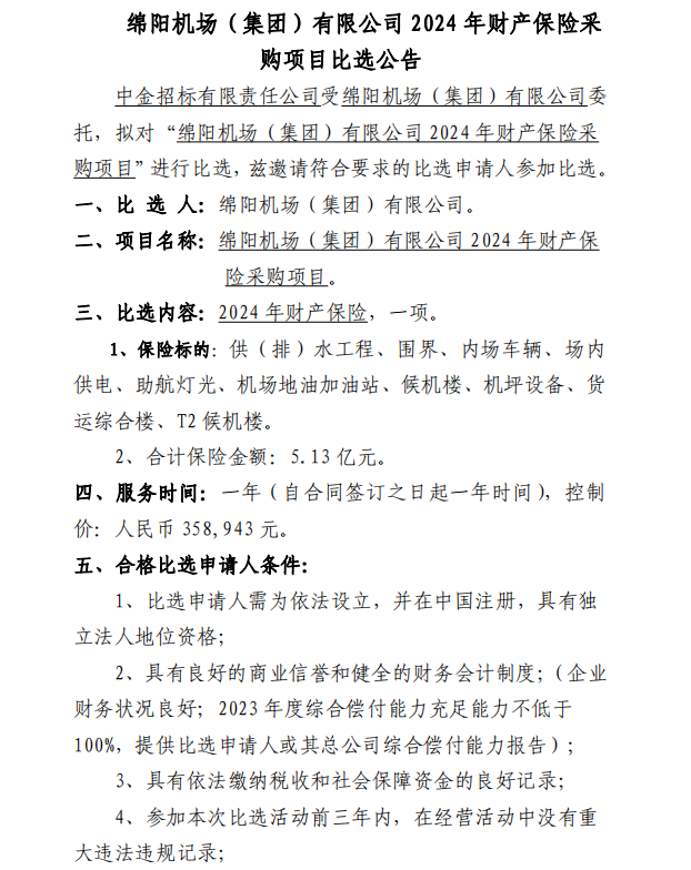 綿陽機場(集團)有限公司2024年財產(chǎn)保險采購項目比選公告